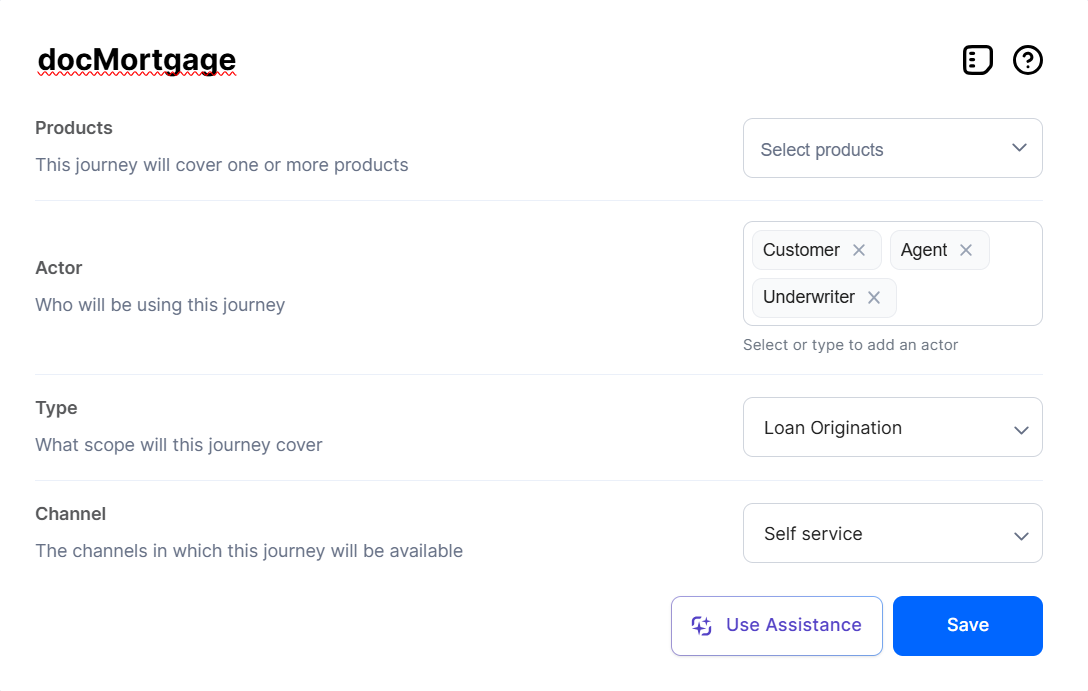 In the settings screen, select the associated products, actors, and channels to enhance the journey context and receive relevant options during the design process.