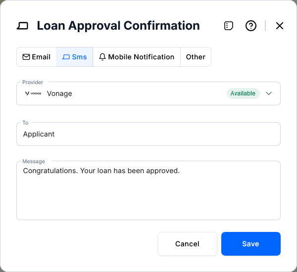 Messages enable communication with users through alternative channels such as push notifications, SMS, and email. Examples include sending one-time passwords via SMS or emailing contract documents. A set of built-in providers for both email and SMS is available, with support for additional providers coming soon.