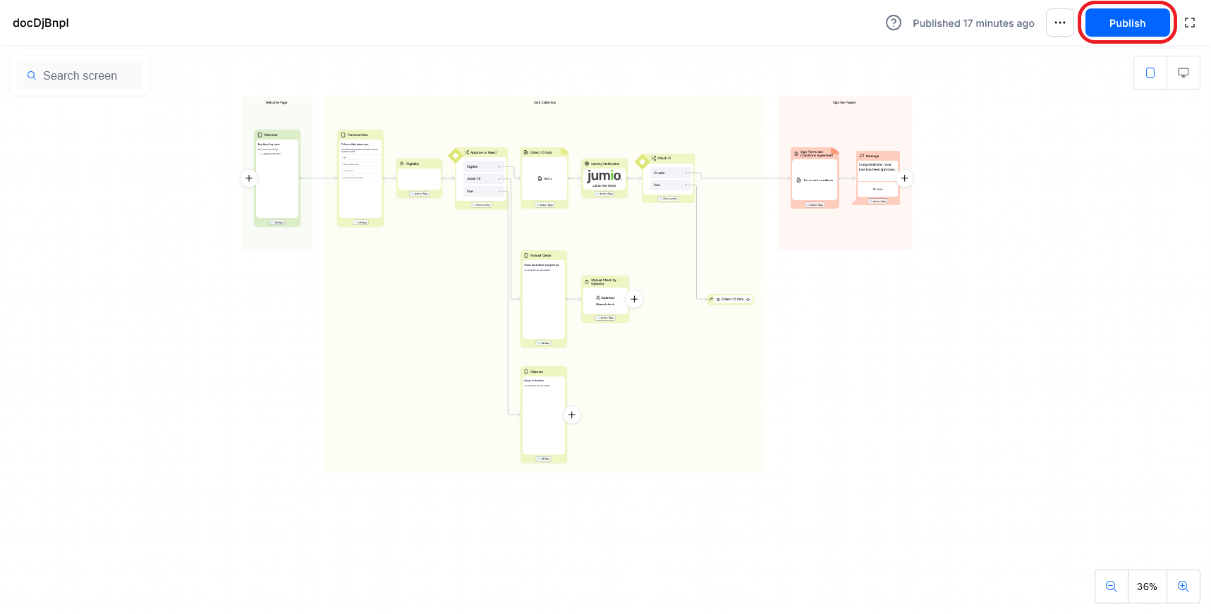 Use the Publish button at the top right corner of the screen to propagate the journey design to the platform, automatically generating a mock-up flow with a matching Flow Map.