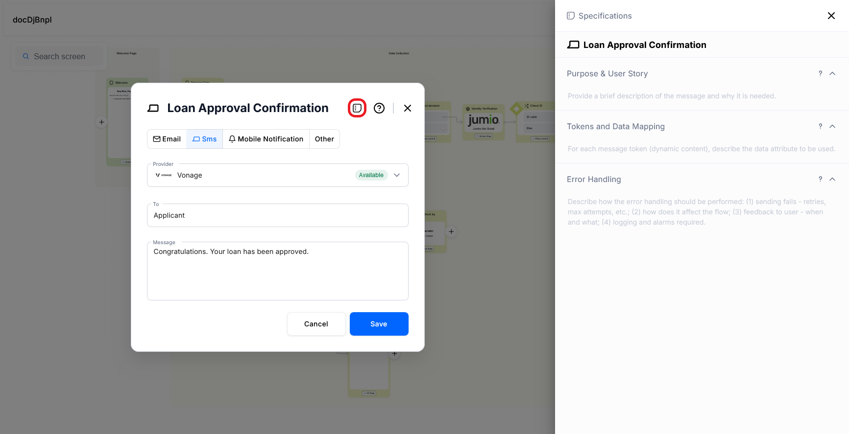 Specifications fields for descriptions, validations, UX definitions, error handling, and more are available at the journey, stage, element, and item levels. To add specifications for a component, click the bullet points icon at its top right corner to slide out the specifications pane.