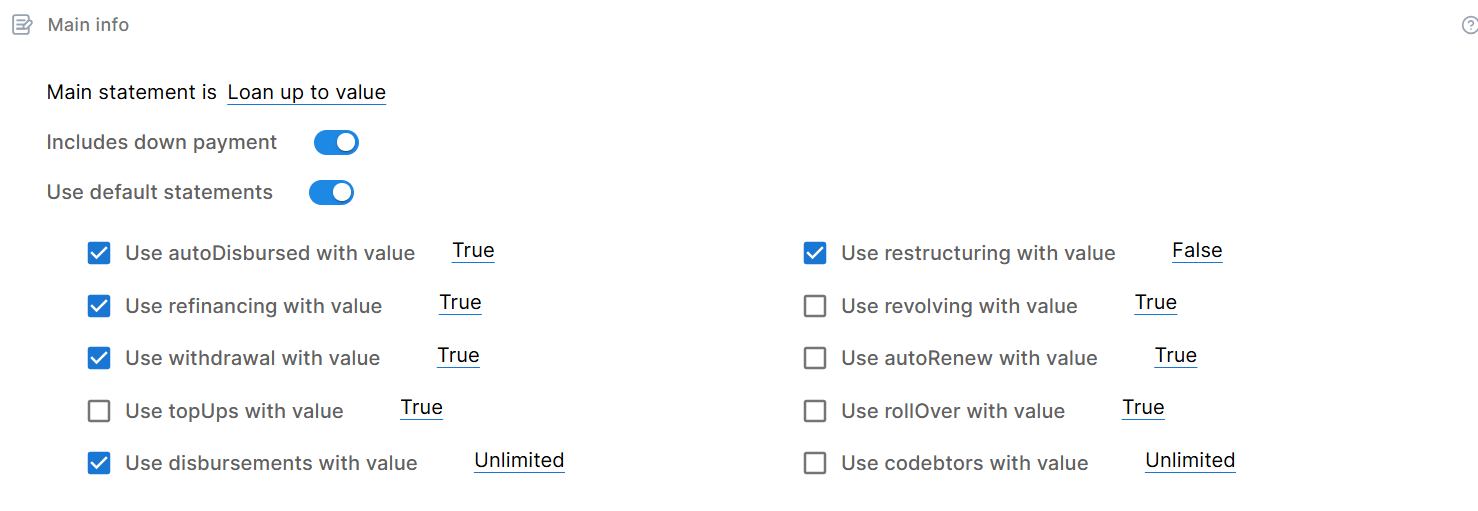 - Main statement is - This option allows you to configure the currency, amount limits, and time ranges for loan repayments or deposit terms.