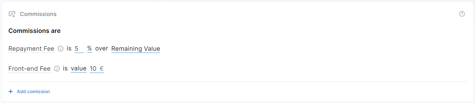 3. We've set two Commissions for the loan: a Repayment Fee of 5% over the Remaining Value, and a Front-End Fee of 10 EUR.