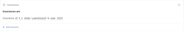 4. The Insurance section, a Monthly Insurance is configured for 5 EUR if the loan amount exceeds 2,500 EUR.