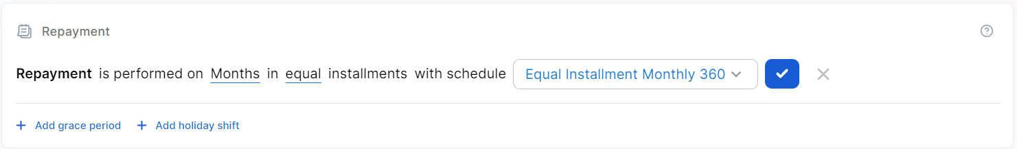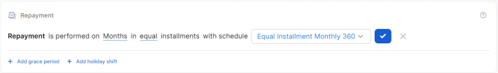 E.g.: Repayment is performed on monthly in equal installments with schedule Equal Installment Monthly 365_TLU. NOTE