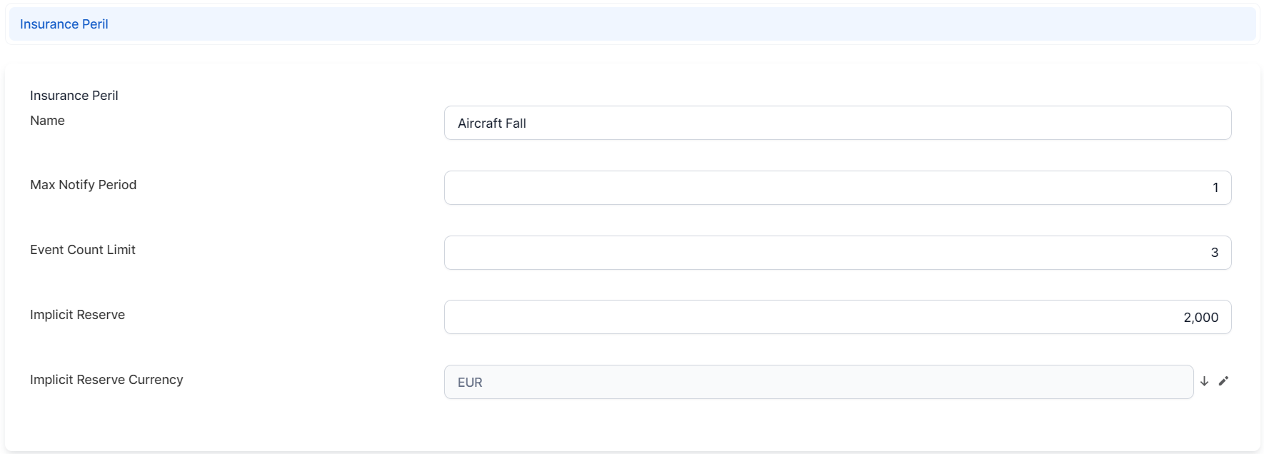 An Insurance Peril, or condition - for example earthquake, car accident, tornados, theft, death, or disability, informs about the type of coverage for a particular insurance product, or product item (coverage). You can define perils independently from products, so that they can be used in conjunction with multiple insurance product templates. Depending on your product, you can attach one or multiple perils, or conditions to it.