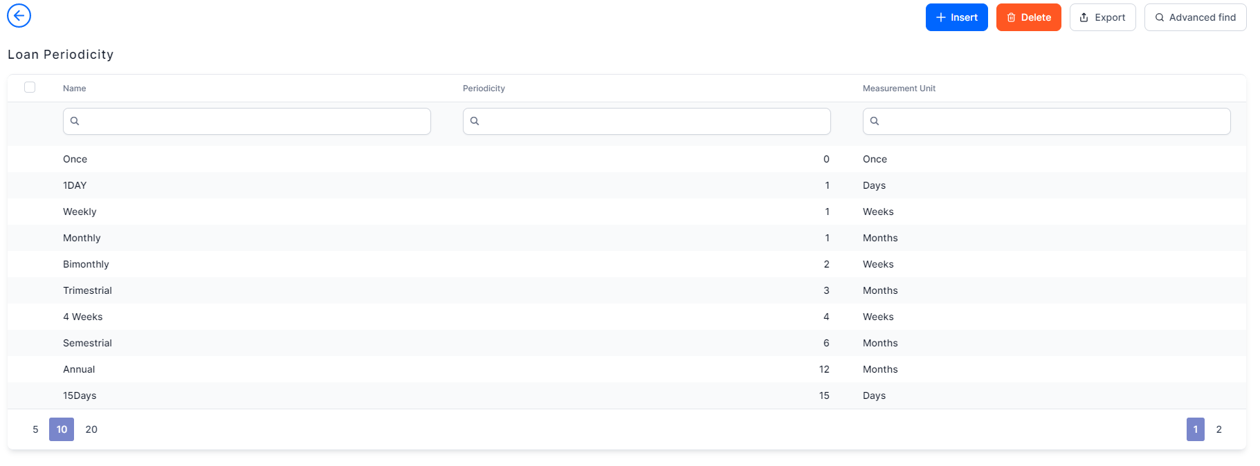 - On the Loan Periodicity page, you can add new loan periodicity record or search, edit, and delete existing ones.