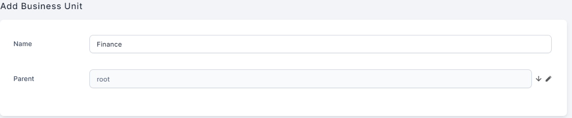 - If this is the first business unit you add, then select root otherwise, select the parent business unit so that it reflects your organization structure. The figure below shows an example on how to add the first business unit.