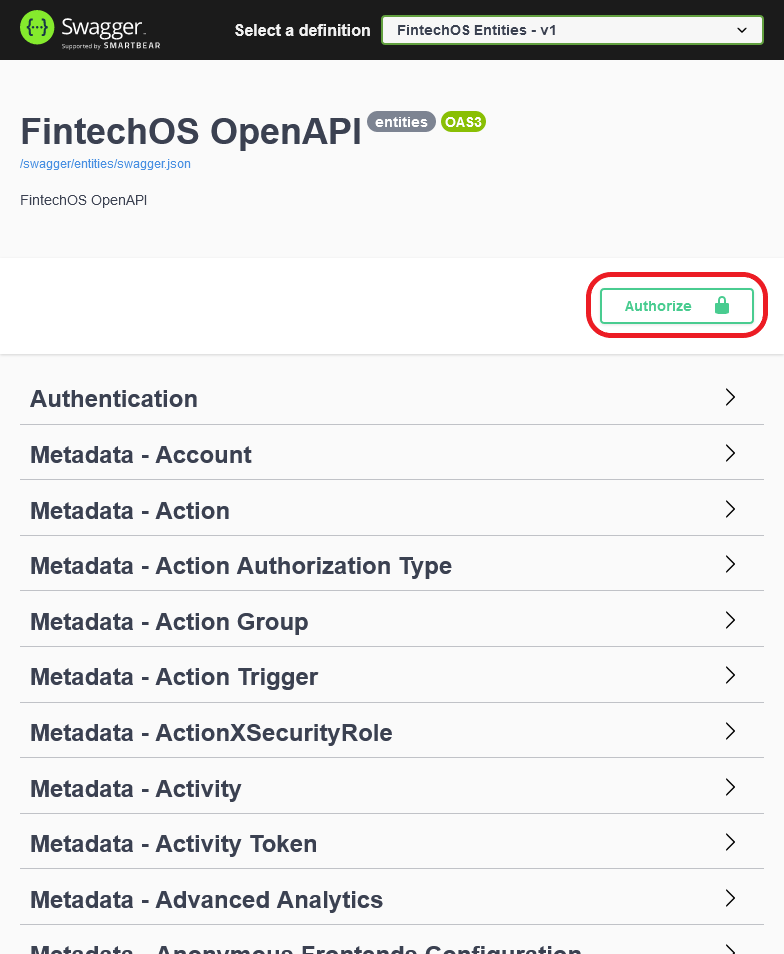 In the Swagger interface, the endpoint is displayed at the beginning of each of the lists of Entity APIs, Endpoint APIs, Digital Journey APIs, and MassOperations API.