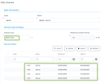 The collection interest is a combination of previously defined fixed and/ or variable interest rates. It can be used for fixed to float interest contracts. The validation of each composing interest is performed on intervals. For example, for a term loan contract, the bank may apply a fixed interest for the first 12 months of the contract, then for the second and third year another fixed interest, and then for the remaining period a variable interest rate.