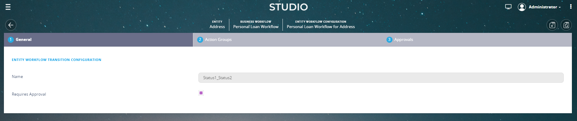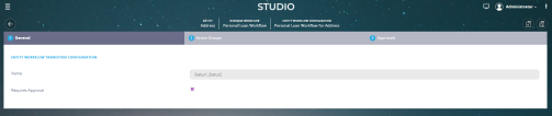 - In the Edit Workflow Transition Configuration the General tab contains the name of the transition and the Requires Approval bool.