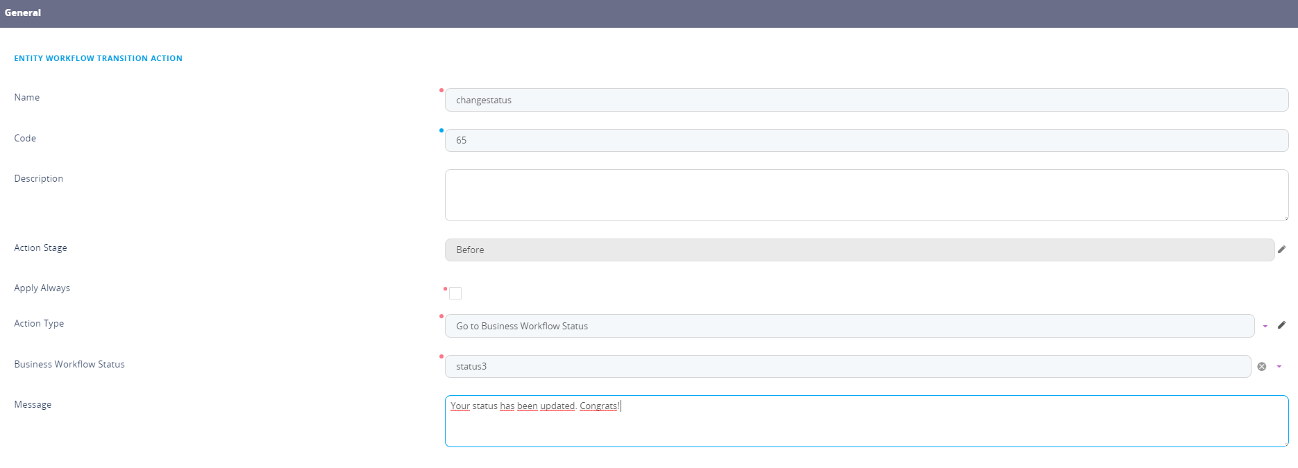- Cancel Transition. You have to enter the Error Message to be displayed if the business condition fails.