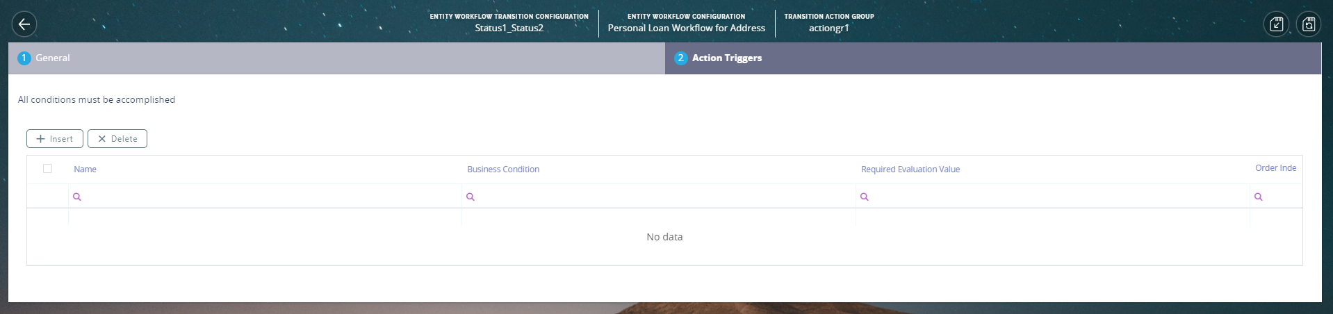 - In the Transition Action Groups section, click the Insert button. The Transition Action Group page appears.