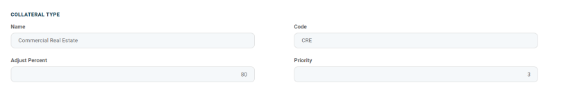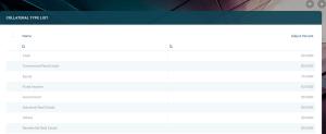When a collateral type is defined, you can set an adjustment percent. The adjustment percent is a customization applied for that collateral. Further, when a collateral is linked to a secured loan contract, it’s market value is automatically adjusted by Core Banking using the adjustment percent.