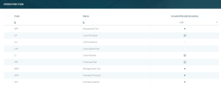 Operation items are those items that relate to a bank's core business, such as all types of fees, commissions, principals, interests, advances or penalty calculations. They can also be considered as balance types that add up to a certain deal or used in tracing what happened on a particular deal. For instance, on the first day of using a new loan, there is only the Loan Principal (LP) on that deal, or it can also have an Advance (ADV) in some particular cases or even a Frond-end Fee (FEF). As the deal progresses, depending on the definition and costs, as well as on repayments, the loan principal can become Paid Principal (PP) or Overdue Principal (OVP) if due amounts are not paid.