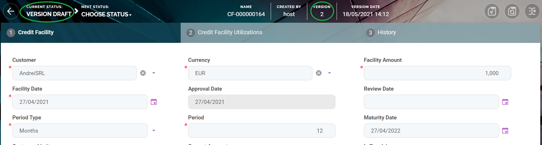 A new version of the credit facility is created, with Version Draft status, thus restarting the life cycle.