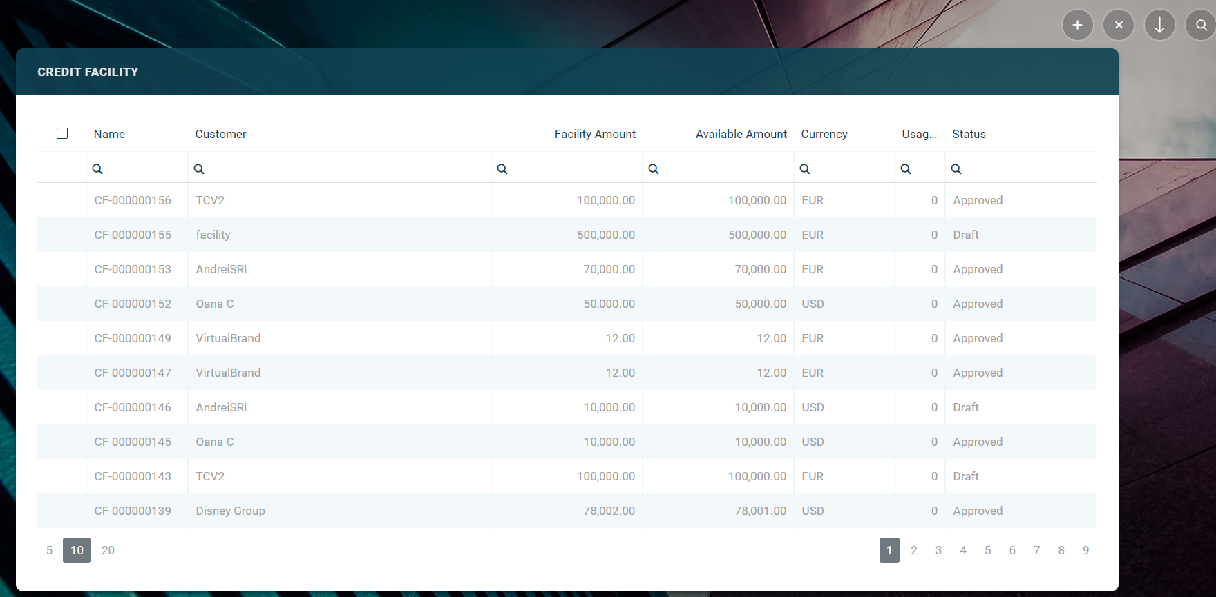 Draft - the status of a newly created credit facility record that was not yet sent for approval. While in this status, you can edit the fields from the record's Credit Facility tab, but you can't add utilizations to it. Send the record to approval after editing all the necessary details.