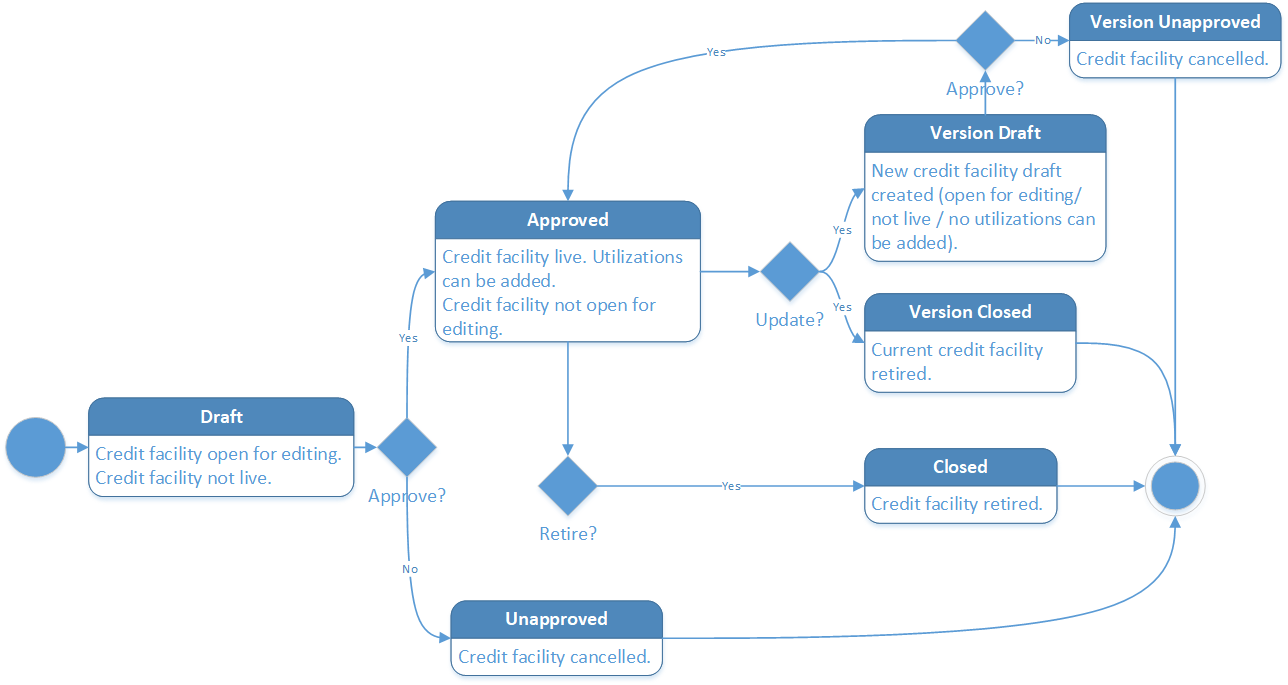 - Every credit facility version starts in a draft state and must go through an approval process before going live.