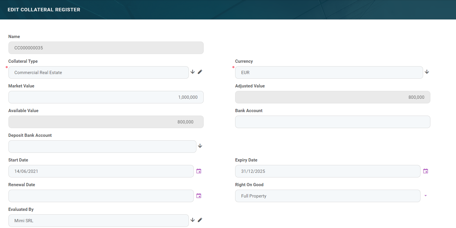 | Last Evaluation Date | No | Invariant Date | For Real Estate collaterals, you can insert the previous evaluation date. Only displayed when editing an existing collateral register. |