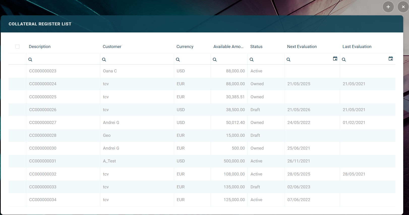 As an alternative, add collateral register records directly from the Customer form for the legal entity or individual customers by clicking on the Insert button from Collateral Register section, as described in the Single Customer View user guide.