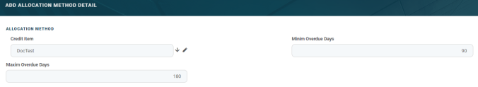 The maximum and minimum number of overdue days is relevant when creating allocation methods as an account can have one or more loan principals. If, for example, there are two loan principals, the allocation method is applied based on the oldest one. Thus, depending on the date, the installment is allocated to the oldest loan principal and then moving to the other credit items. -