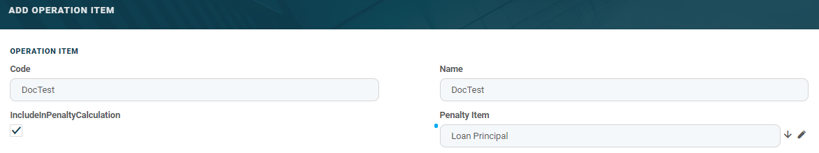 When editing credit items, the IncludeInPenaltyCalculation bool is available. If selected, the penalty amount is taken out of the account first. For more details, seeFTOS_CB_OperationItem.Minimum Overdue days No Whole Number The minimum overdue days of the credit item. Maximum Overdue days No Whole Number The maximum overdue days of the credit item.