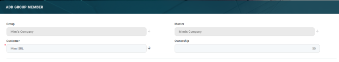 Follow the instructions from the Groups page of this guide, selecting a customer to add as a member, and entering an ownership percentage.