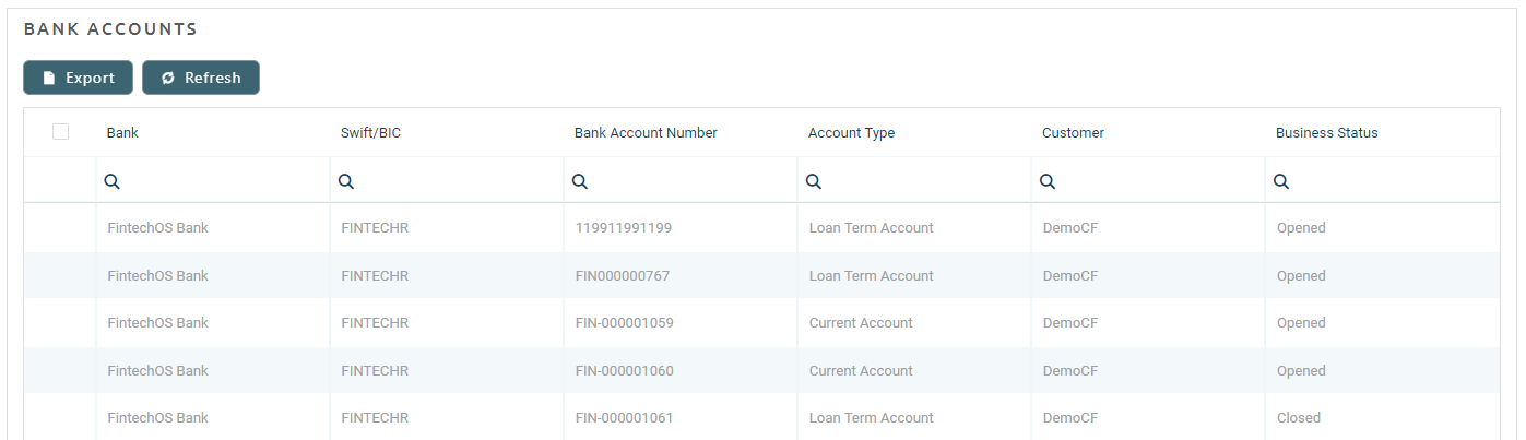 This section lists the company’s bank accounts, with details such as name of the bank, Swift/BIC, account number and type, customer, and business status.