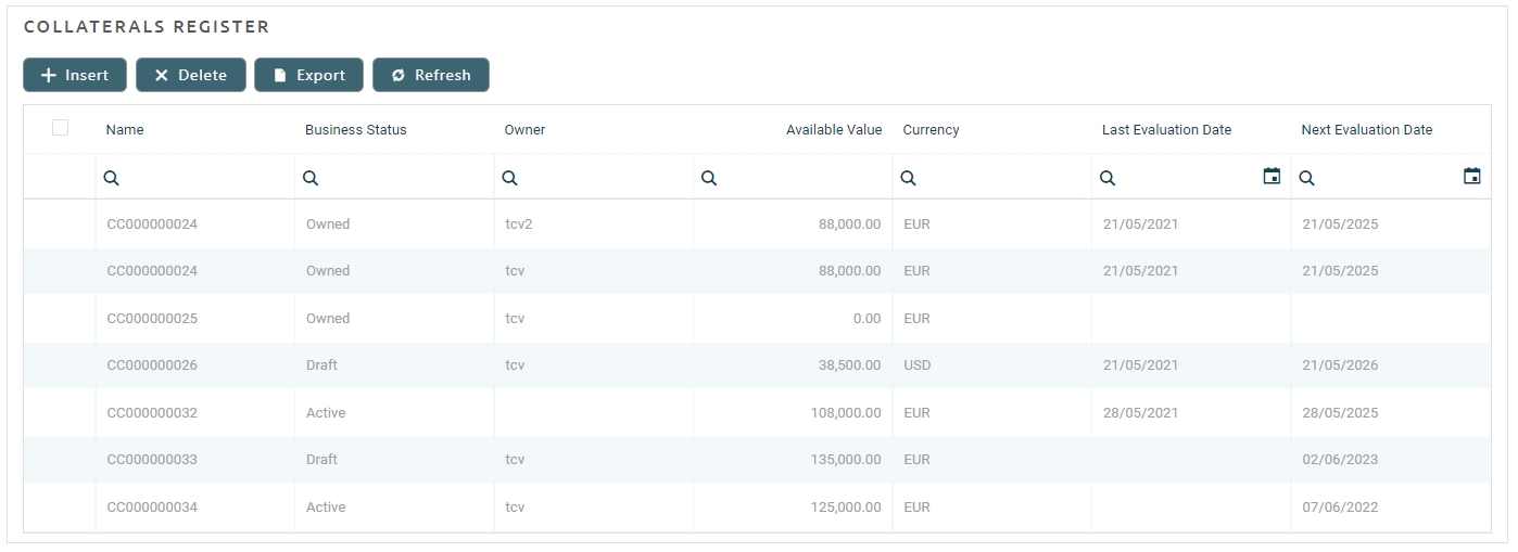 In this section, you can add new collateral register records, view the existing ones by clicking the desired record from the list, delete records from the list and export the list.