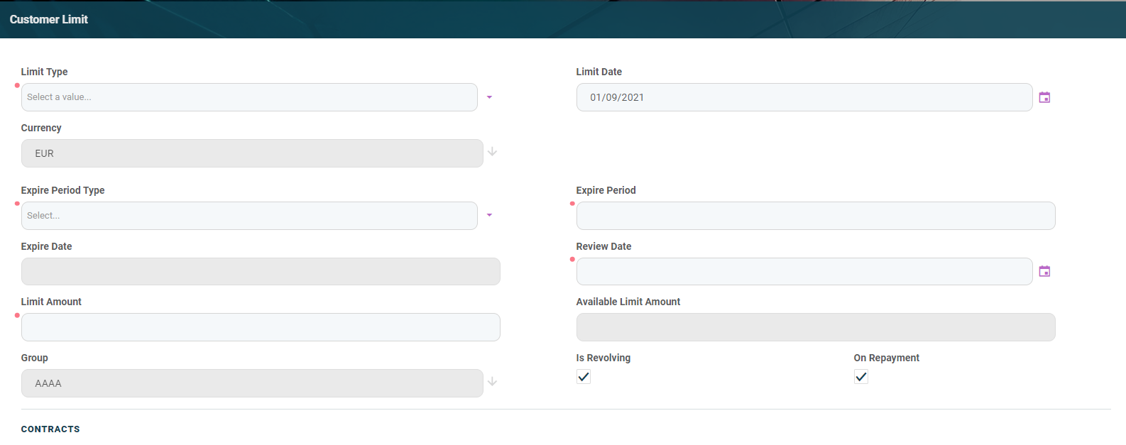 Click the Insert button within the Limits section. The Customer Limit page is displayed, with the customer, the group and the currency automatically completed with the current customer's values.