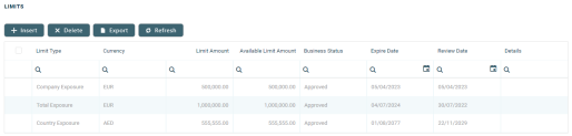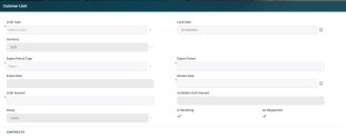 This section lists all the customer’s limits. If the customer is a group, then all the limits applicable for the group, coming from group members, are listed here.