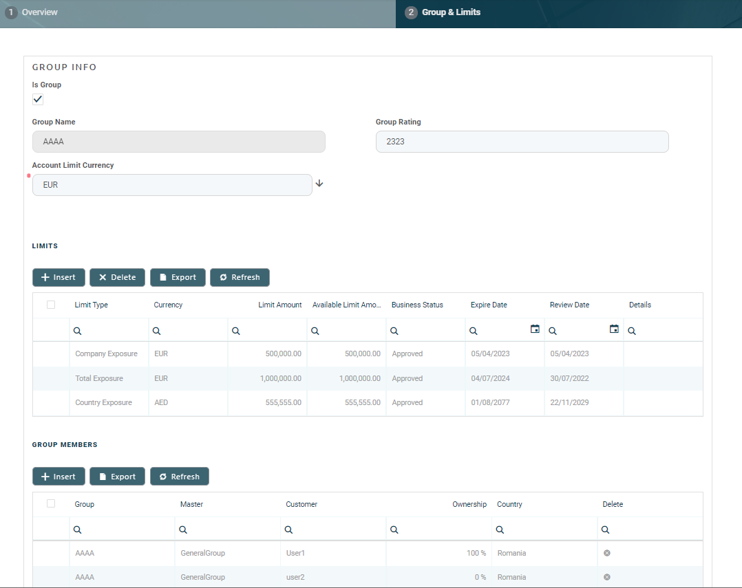 LimitMandatoryForIndividual = True, limit validations for a group containing individual customers happen the same way as for groups composed solely of legal persons.The following sections within this tab display specific information: