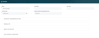 Click the Save and Reload button at the top right corner of the page. The customer is saved in Newbie status, with minimum information, such as an auto-generated customer number, but the page displays now a series of sections that assist you in adding or viewing information about the customer: Company Representatives, Products, Bank Accounts and Collateral Register. A newly displayed tab, Groups & Limits, helps you with the configuration of group membership and limits for this customer.