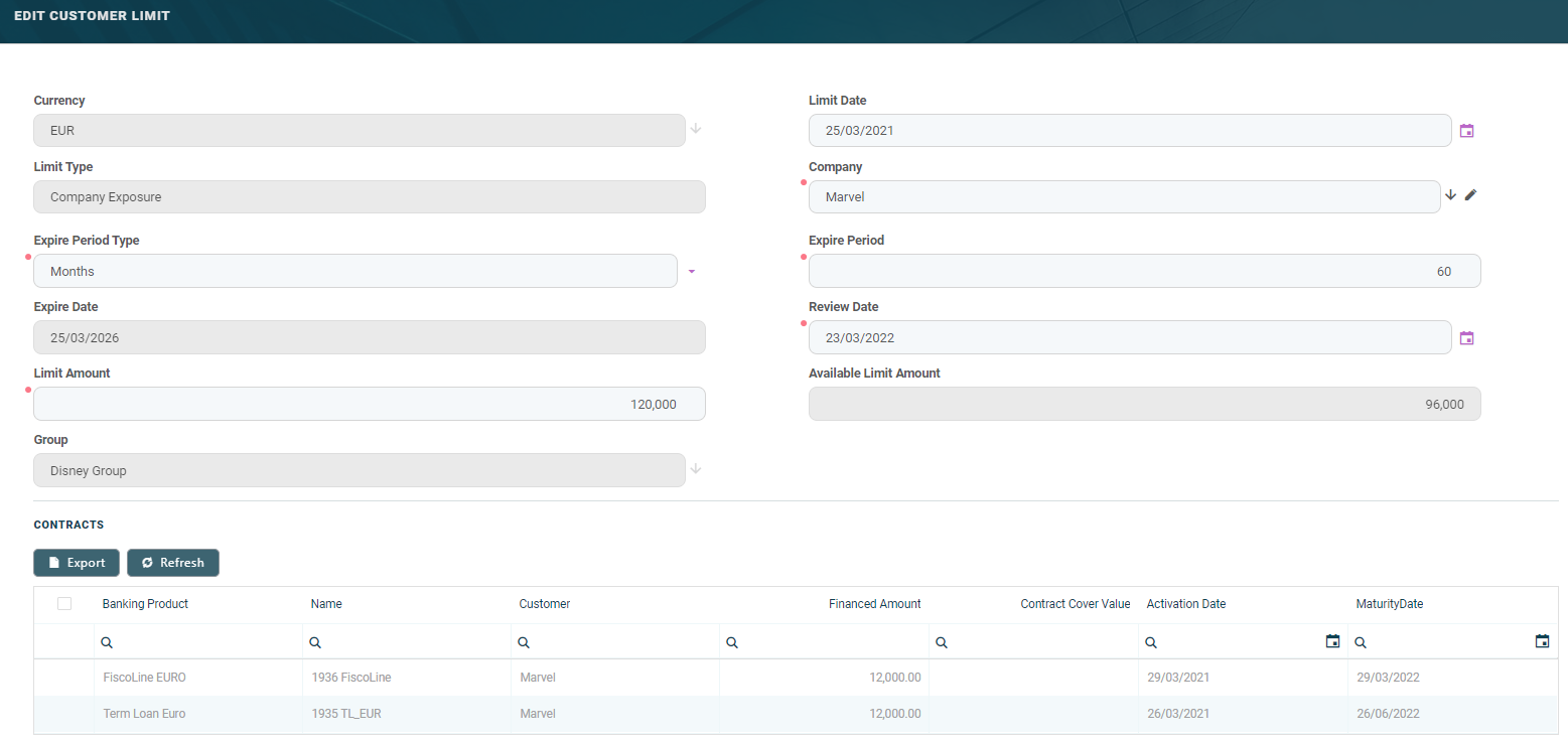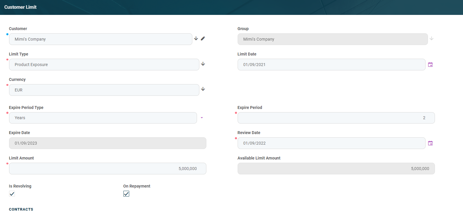 The correlation between the limits and group is important as the limits on the parent entity affect the child entities. If the customer is a group, two additional types of exposures are available: country and company exposure.Limit Date Date Enter the date when the limit becomes active. It is automatically completed with the current date, but it can be changed. Currency Lookup Select the currency for this limit. Expire Period Type Option set