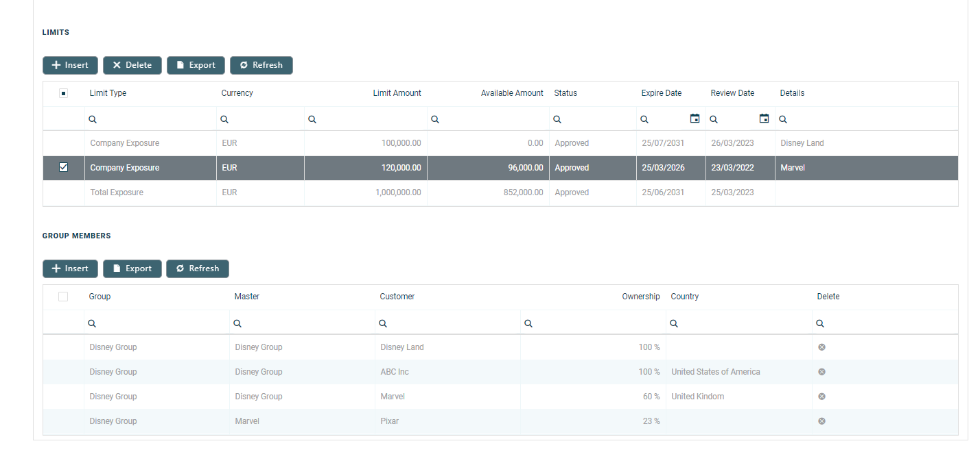 The correlation between the limits and group is important as the limits on the parent entity affect the child entities. If the legal entity is a group, two additional types of exposures are available country and company exposure.Expire Period Type Option set