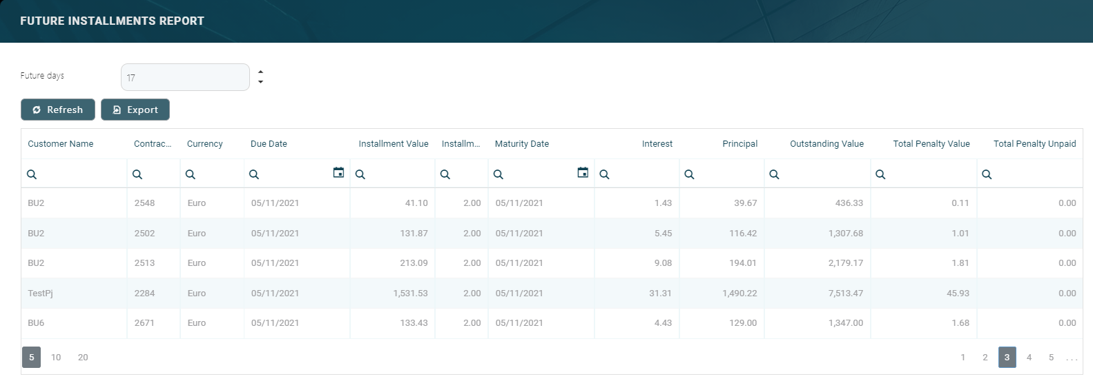 DaysFutureInstallmentsReportCore Banking system parameter. You can generate the report for a different number of days simply by changing the value of the Future days field within the Future Installments Report page. The report displays the following information about the future installments: customer name, contract number, currency, due date, installment value, installment number, maturity date, interest, principal, outstanding value, total penalty value and total penalty unpaid.