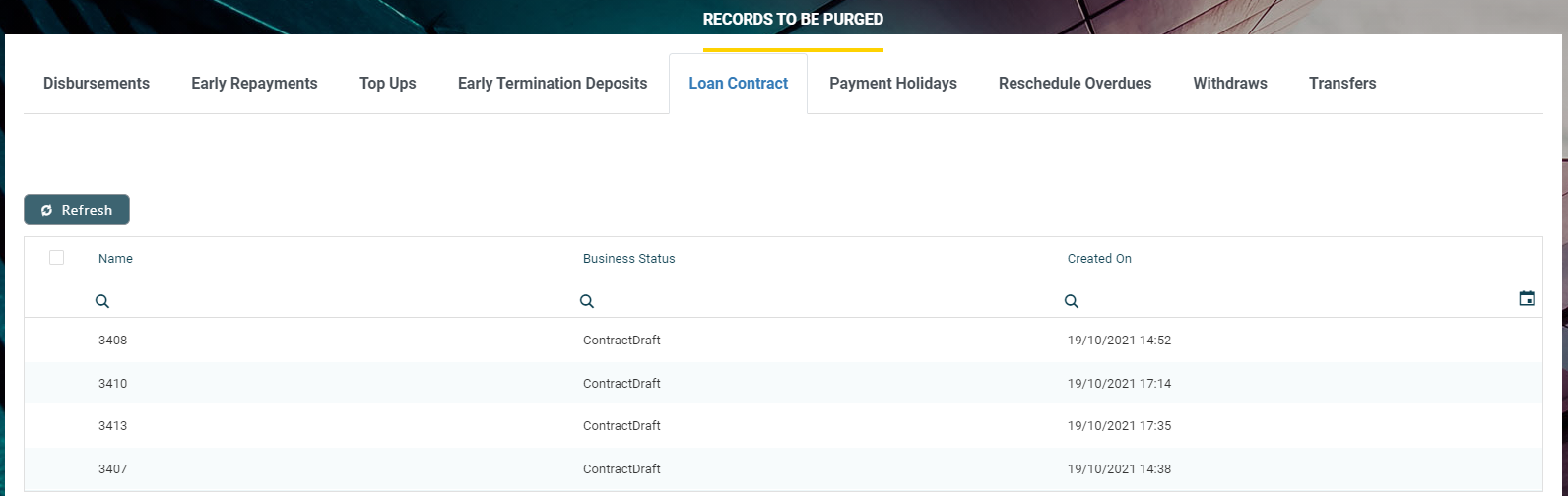 Draftstatus that are scheduled to be deleted at the current day's end, grouped on tabs specific for each transaction type: disbursement, early repayments, top ups, early termination for deposits, loan contracts, payment holidays, reschedule overdue, withdraws and transfers.