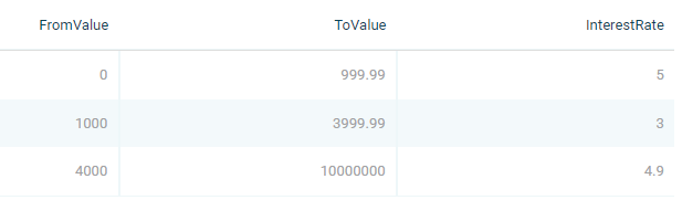 The banded interest, applicable for contracts based on current account with overdraft banking products, can be defined as a collection of values that is applied depending on the amount. For example, the bank wants to apply an interest rate of 5% for borrowed amount between 1 and 999.99, an interest rate of 3 % for the amounts between 1000 and 3999.99, and an interest rate of 4.9% for amounts surpassing 4000.