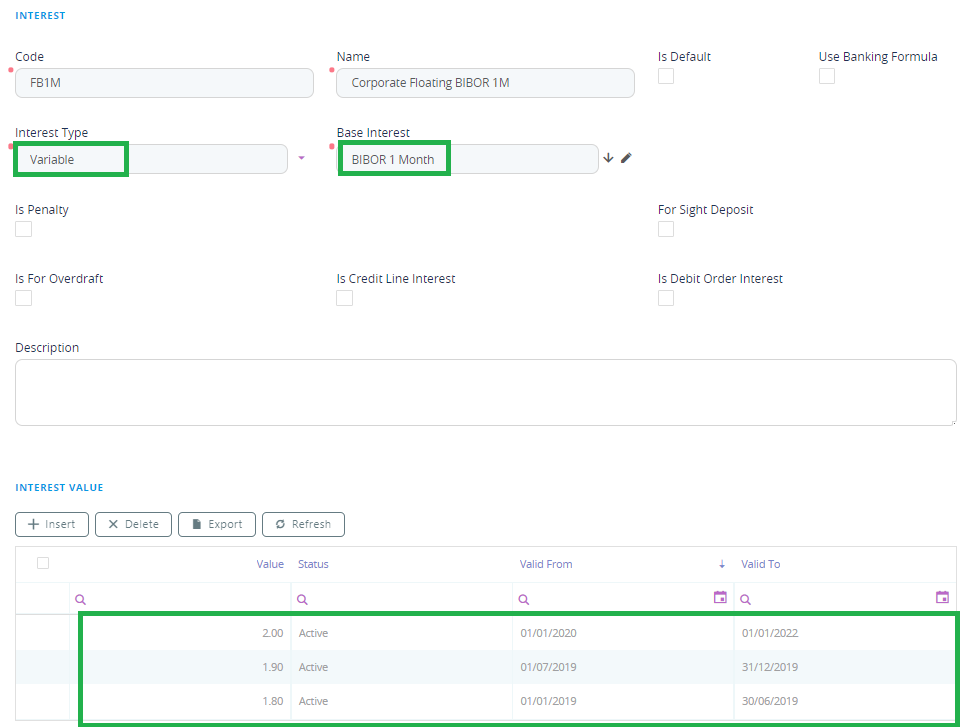The collection interest is a combination of previously defined fixed and/ or variable interest rates. It can be used for fixed to float interest contracts. The validation of each composing interest is performed on intervals. For example, for a term loan contract, the bank may apply a fixed interest for the first 12 months of the contract, then for the second and third year another fixed interest, and then for the remaining period a variable interest rate.