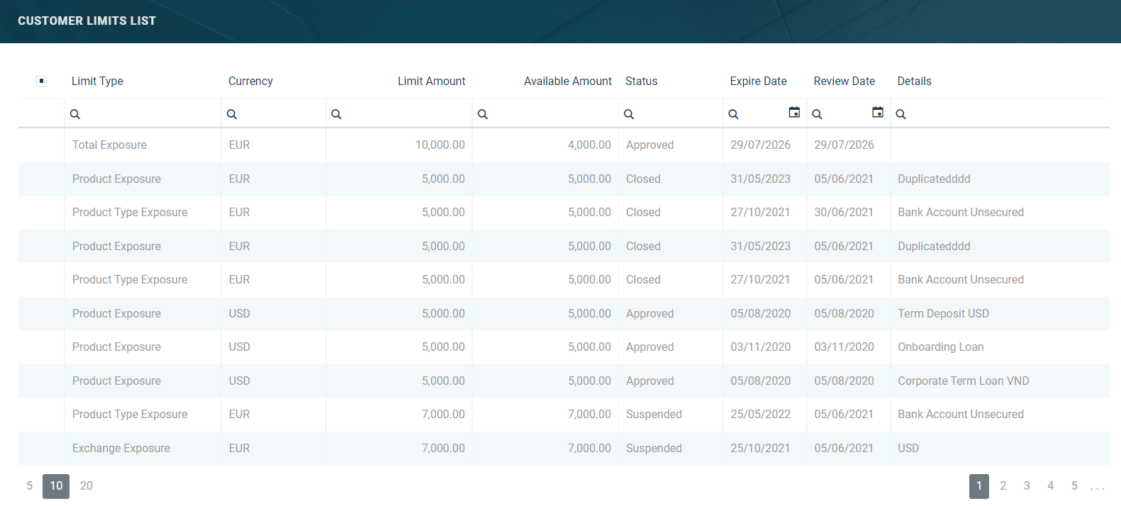 - Suspended - the status of limit records which are suspended at the moment and cannot be used. If a customer is introduced into a group, the customer's limits are all suspended automatically until the limit records are reviewed and new versions are created for them with updated information.