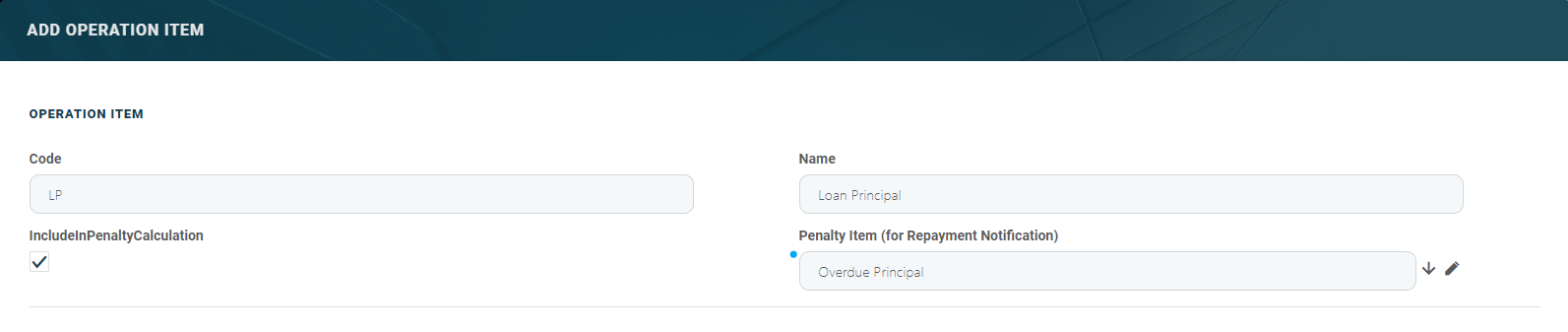 | Penalty Item (for Repayment Notification) | Yes | Lookup | This field is displayed and mandatory only if Include In Penalty Calculation = True. Select from the list an existing operation item in whose penalty calculation this new item must participate. |