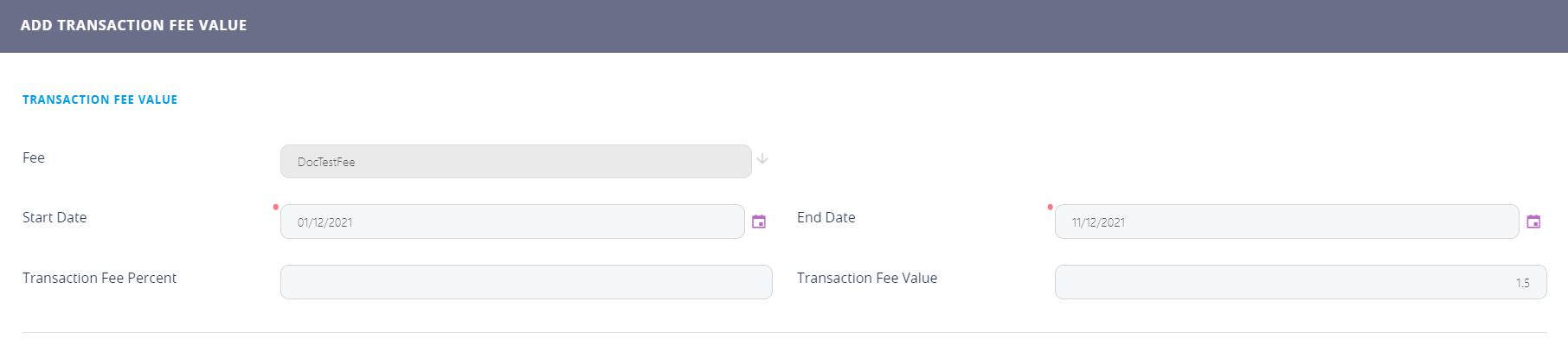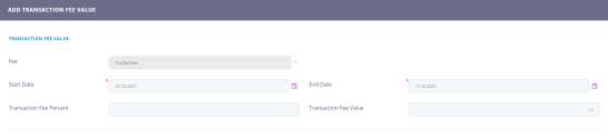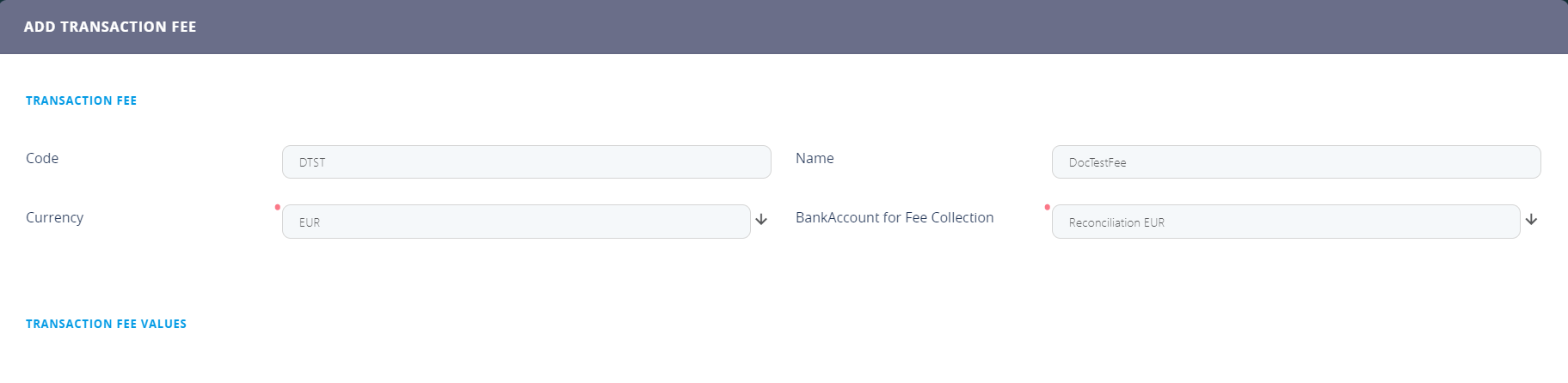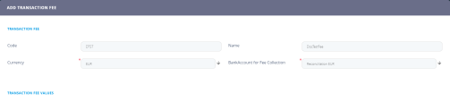A new section, Transaction Fee Values, is displayed after saving the record. The values of the transaction fee are managed within this section.