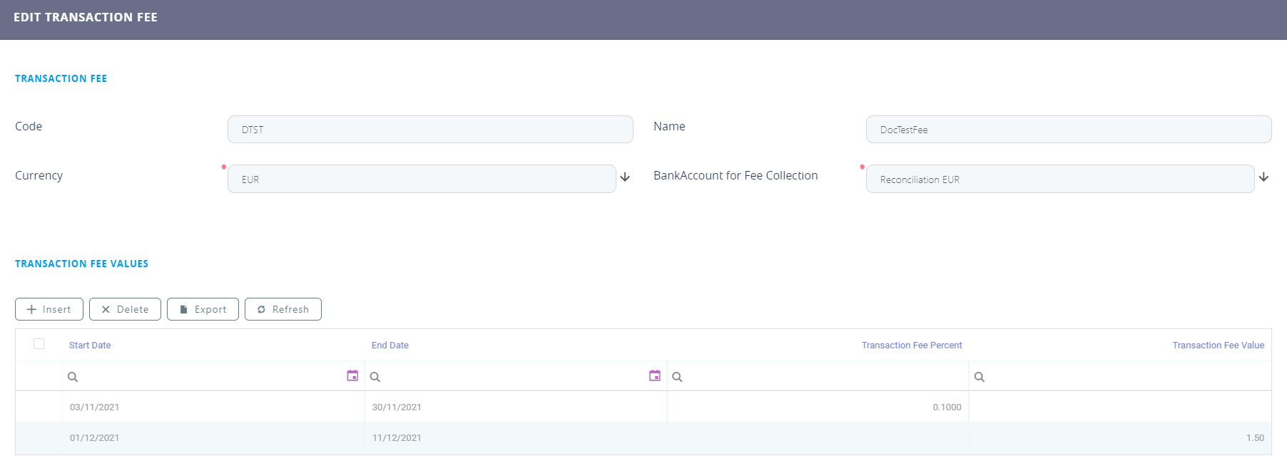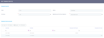 Create a new transaction fee record by clicking the Insert button at the top right corner.