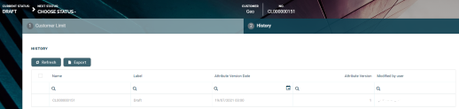 - Click the Save and Reload button at the top right corner of the page. A number is automatically generated for the limit record and the name of the customer is filled in and displayed at the top of the page. The History tab is also displayed, containing information about each version of the record.