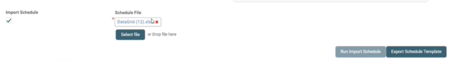 Select the Import Schedule checkbox. The Schedule File field is displayed, with the Select file button. The Export Schedule Template button is also displayed. A warning message informs you that "The previous repayment schedule was generated by the system".