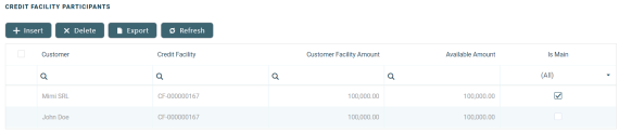 In the Credit Facility Participants section, you can insert, delete or export customers who can participate in this credit facility. After the first save operation, the customer is added as the main facility participant. If the customer is a group, then all the group members are also added.