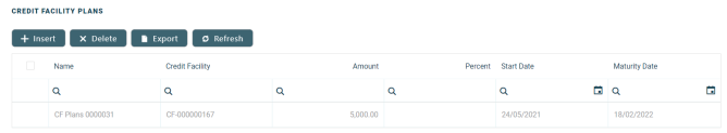 In the Credit Facility Plans section, you can insert, delete or export plans for the increase or decrease of the facility amount during the credit facility's duration.