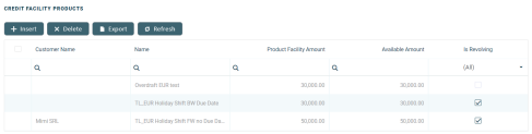 In the Credit Facility Products section, you can insert, delete or export banking products which can be utilized through this credit facility.