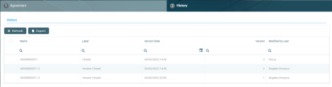 History tab - This tab only appears after saving the agreement record. It displays the versions of the agreement, along with workflow status and the user who modified the product.