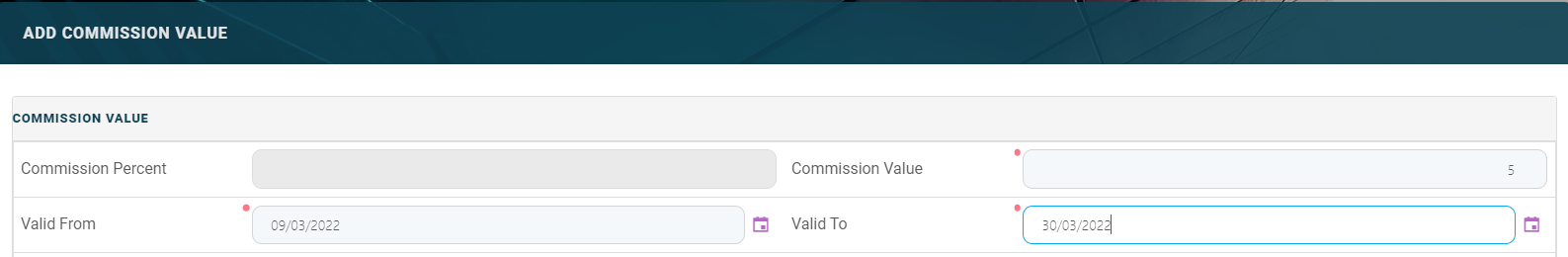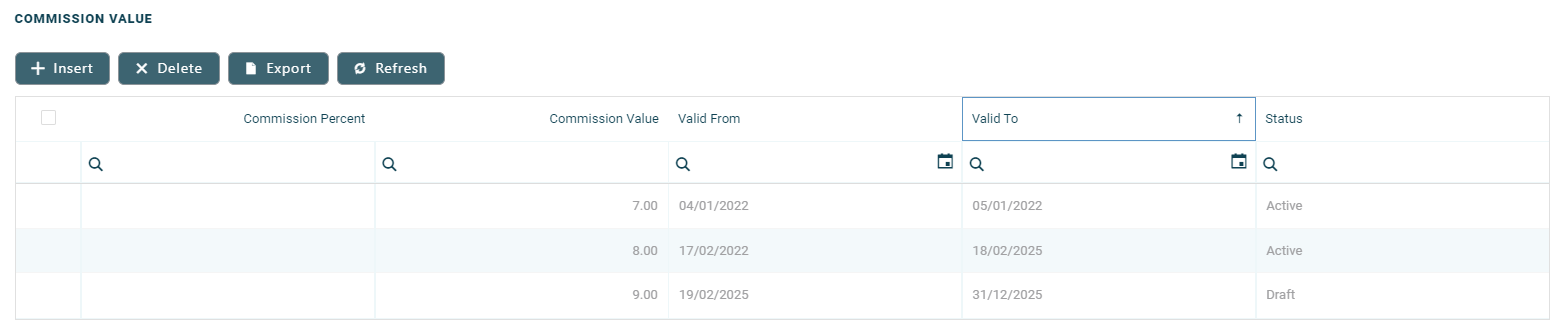 | Valid From | Yes | Date | Select the first day when the commission value becomes applicable. |