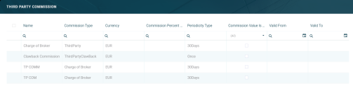 ThirdParty(out-of-the-box third-party commission type)ThirdParty Clawback(out-of-the-box third-party commission type, defined for clawback commissions)- Other third-party commission types defined by your users.